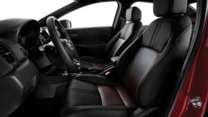 Ghế lái bọc da với viền chỉ đỏ thể thao mang lại ấn tượng thị giác đầy cuốn hút (RS).