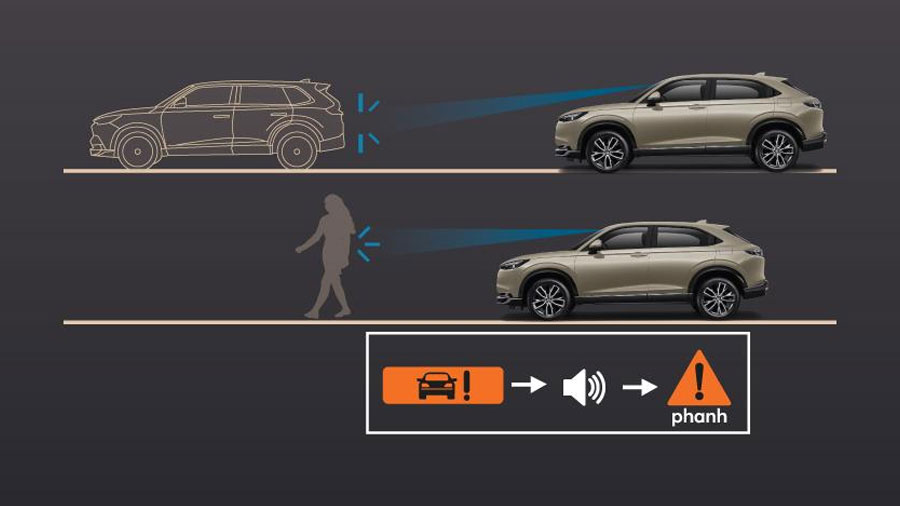Phanh Giảm Thiểu Va Chạm (CMBS) Cảnh báo người lái khi phát hiện vật cản phía trước. Ngoài ra, trong trường hợp người lái không thể tránh khỏi va chạm, hệ thống sẽ tự động phanh để giảm thiểu thiệt hại.