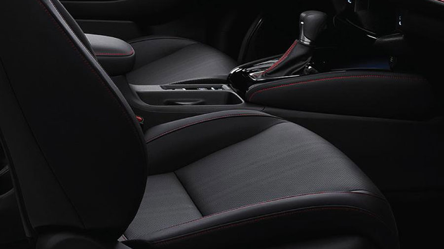 Nội thất bọc da sang trọng với viền chỉ đỏ nổi bật, thể hiện tinh thần thể thao mạnh mẽ (e:HEV RS).
